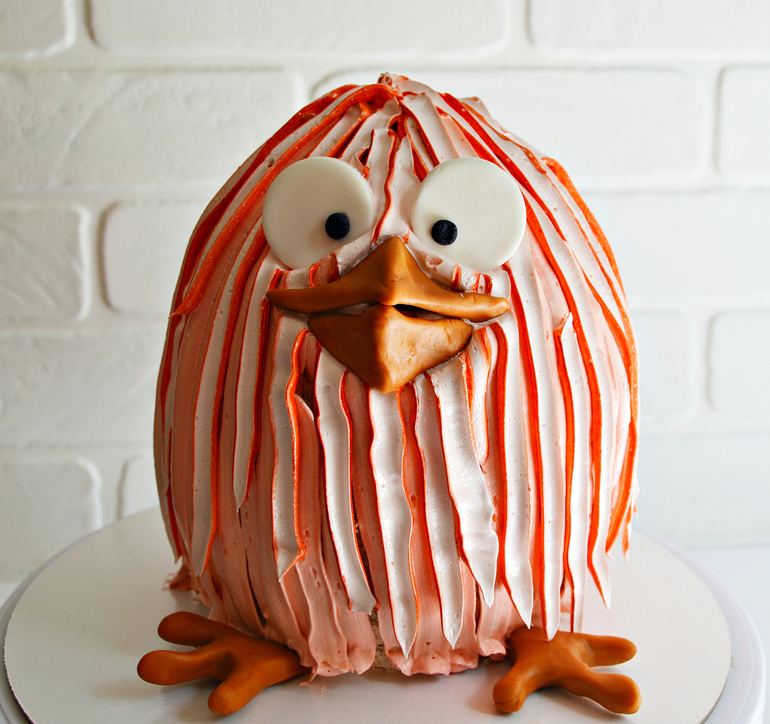Расположите глазки, клюв и лапы. На белковом креме они хорошо держатся.