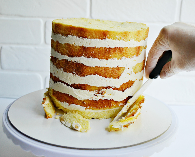 Задаем нужную форму. С помощью ножа немного срежьте торт в нижней части. Торт должен остаться устойчивым.