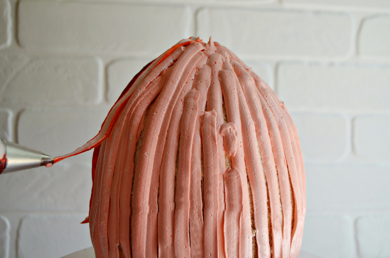 Приложите насадку к верхней части торта. Начните плавно выдавливать крем и, не вынимая насадку, медленно поднимайте ее вверх. У Вас должен получиться элемент, похожий на шарик-столбик. Для гребешка он может быть деформированным.