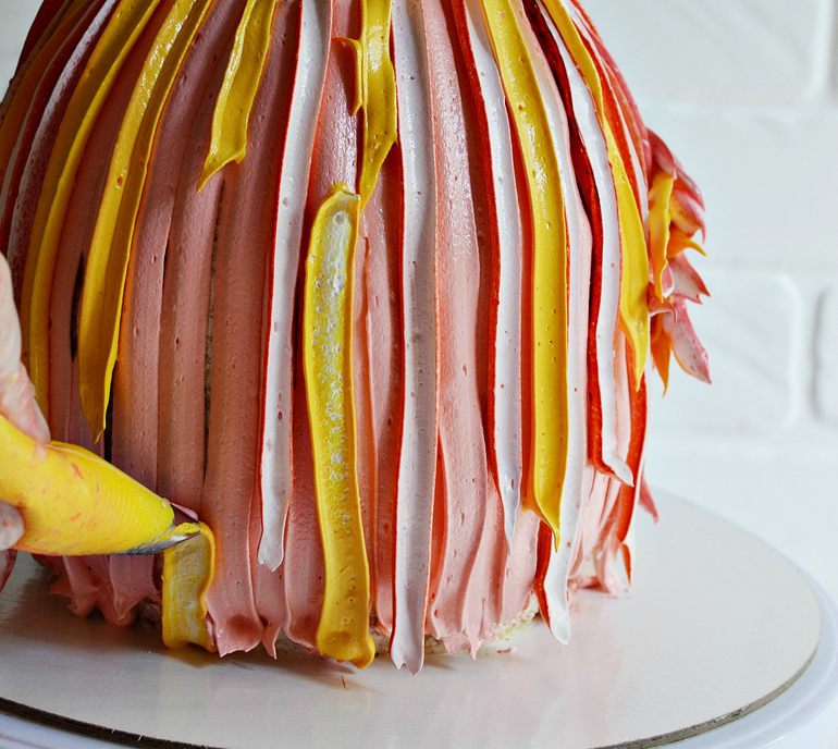 Выполните необходимое количество линий. Не делайте слишком много рядов, чтобы «перья» хорошо держались на торте.