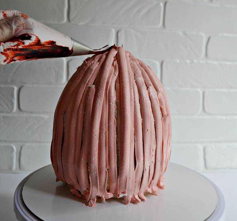 Продолжайте выдавливать крем и ведите насадку по направлению вниз. Не прижимайте ее к торту