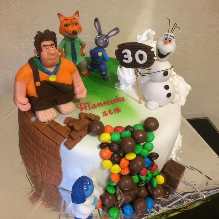 РАЗНОЕДевочки хочу поделиться с вами тортиком, фигурки на который хотела заказать у какой нибудь из ББ-шечек)))! Поступил заказ за 1,5 месяца на тортик, я дату забронировала за молодым человеком, который хотел заказать торт для своей девушки на 30 летия. Девушка очень любит мультики что нибудь мультяшное. Но согласившись я не думала что это будет такого масштаба. Короче заказывает лиса и зайку из зоотопии, ральфа с кирпичами, печальку из головоломки, олафа из холодного сердца и рассыпанные конфеты. Торт на 5 человек кг на 2))) представляете что творилось в моей голове? Я никак не могла представить сюжет торта, даже советовалась с Оленькой ББ. Не знала как такие объёмные фигурки уместить на маленьком тортике))