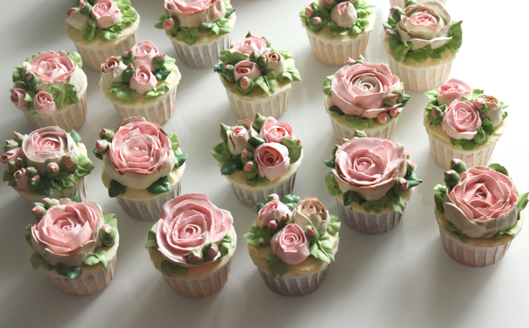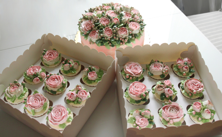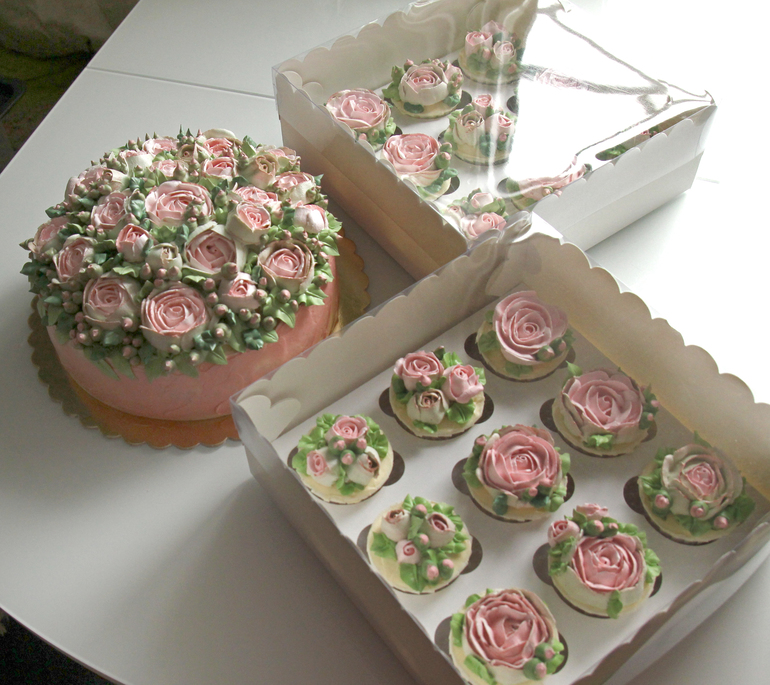на мой вкус самый красивый торт и капкейки с кремовыми цветами! Цветовая гамма мне по душе. Бутончики как настоящие!!