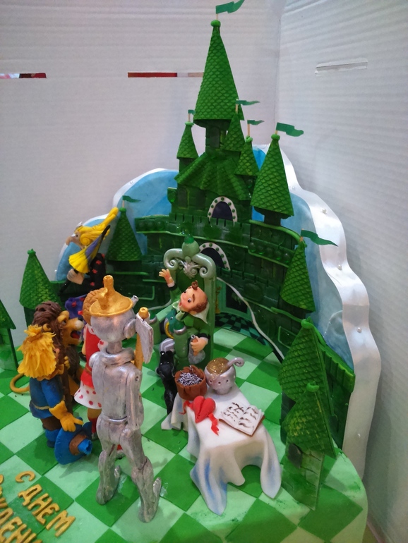 Даже не знаю,с чего начать.Обратилась ко мне девушка с вопросом по цене торта с моего сайта,по мотивам Жанны Зубовой с кучей фигурок.Сразу сказала,что ее интересуют сложные торты.По цене все устроило,начали обсуждать дальше.Говорит-если ничего не придумаем,сделаем просто торт с фигурками,как на фото.Потом остановились на идее Изумрудного города и она ушла на время обдумать дизайн(сама она дизайнер интерьера).Потом присылает мне макет