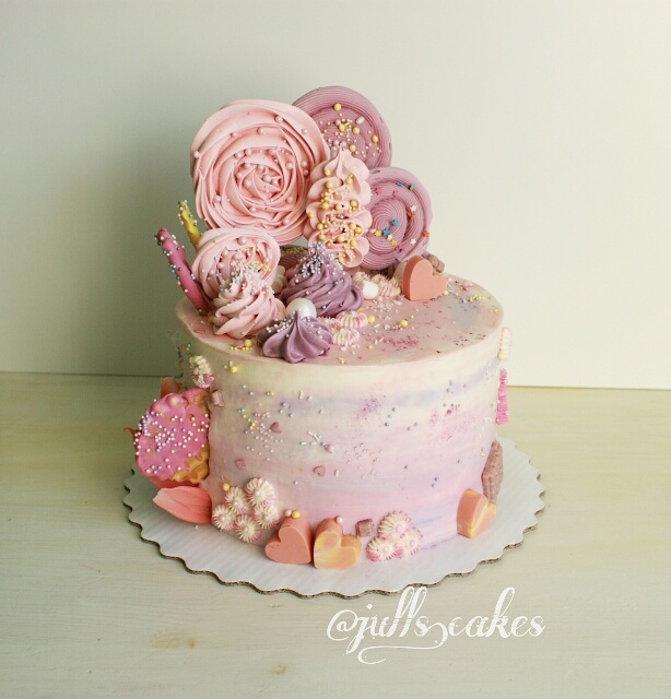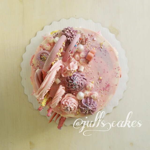 Внутри ванильный бисквит, сливочный крем, малиновый и клубничный кули, ганаш на белом бельгийском шоколаде с кокосовым кранчем. В декоре безе, сахарный бисер, конфеты, шоколад