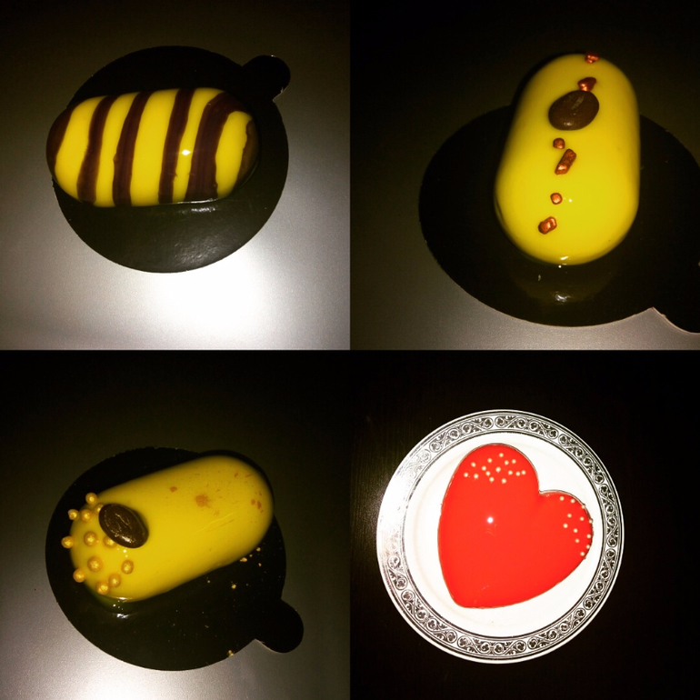 залито ровно, формы стандартные, но сделано аккуратно, а вот декор вообще ни о чем... на муссовые торты недостаточно просто шариков накидать (даже их расположение на сердце, например, не красивое), важна композиция. для начала пробуйте повторять чужие торты точь-в-точь, а потом уже и свое видение придет по декору