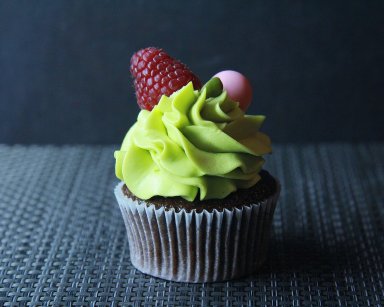 Спасибо) Крем - обычный кремчиз на масле, в половину добавлен растопленный горький шоколад, в половину - фисташковая паста.