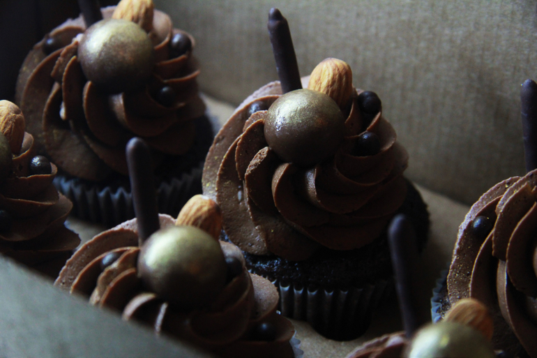 Шоколадные и те и другие. Одни с малиновым конфи внутри и фисташковым кремчизом сверху, другие внутри с соленой карамелью и шоколадной шапочкой.