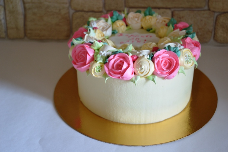 Ну ничего себе не все идеально))) Очень красиво и со вкусом, цветы аккуратные, тортик ровненький)) скажи, а ты когда крем разных цветов делаешь, каждый цвет в отдельный пакетик и потом собираешь рисунок из цветов? Или одним цветом сделала все, что надо, помыла пакетик, другим цветом пошла.. (Я скряга, мне пакетики жалко, я их мою и использую, пока не порвутся).