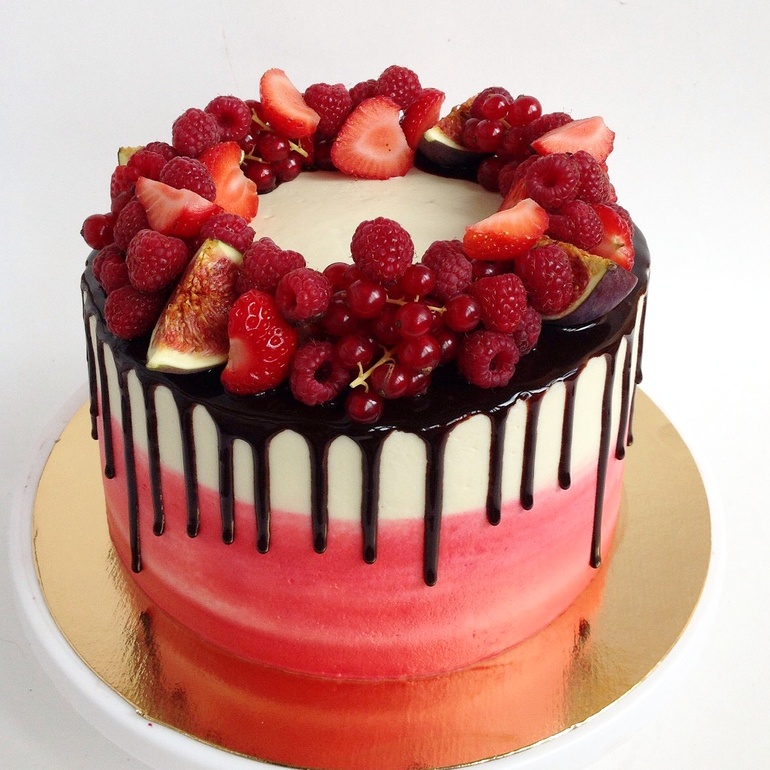 Украшение тортов кремом,шоколадом, фруктамиВнутри классический бисквит , с кремом на основе маскарпоне и много свежей клубники и малины. Весом 3 килограмма.