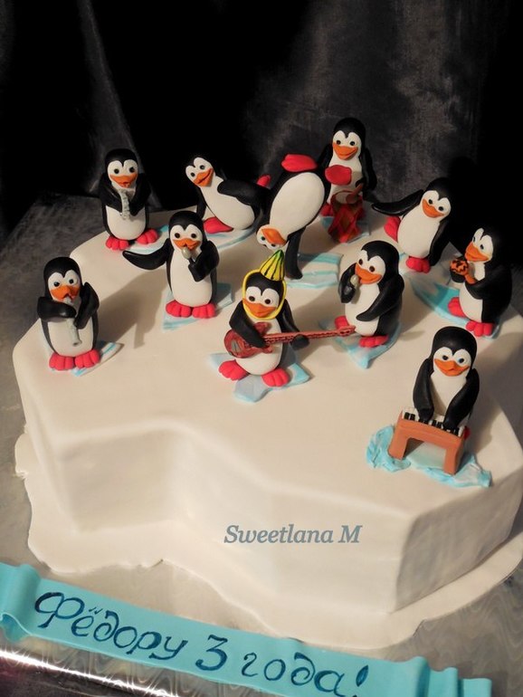 Торты детскиеУ мальчика папа гитарист,все друзья семьи музыканты.Поэтому мне пришла в голову такая идея,где все пингвины пришли поздравлять именинника и устроили шумную музыкальную вечерину.В колпаке по центру сам именинник)