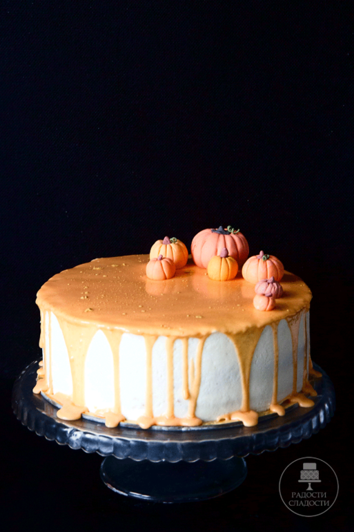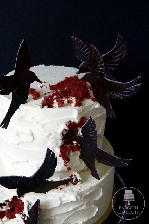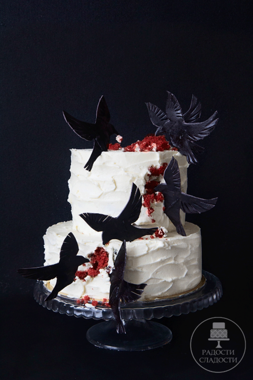 Оба торта - красный бархат. Черных воронов и тыковок сделала из мастики.