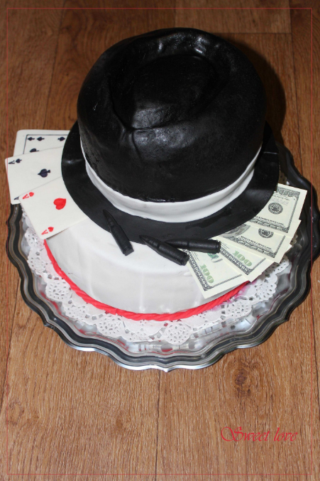Торты тематическиеСама себе напеклааа))) Внутри -мой любимый ванильный бисквит с клубникой и персиками, в шляпе-три шоколада. От веса весы зашкалило))) денежки бумажные, пули сделаны с помощью формочек для льда, карты нарисовала.