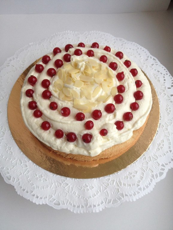 Для крема берем молоко, добавляем лаванду, 1/4 стручка ванили, сахаразаменитель. Доводим до кипения и убираем с огня. Даем постоять минут 10. Процеживаем. Желатин замачиваем заранее. Желтки смешиваем с крахмалом. Хорошо перемешиваем. Добавляем горячее молоко в желтки хорошо перемешивая. Переливаем полученную смесь в кастрюльку. На медленном огне доводим до кипения, постоянно помешивая венчиком. После закипания готовим еще минутку помешивая. Снимаем крем с огня, добавляем желатин, хорошо перемешиваем. Охлаждаем до комнатной температуры. Затем крем протираем через сито. В миксере взбиваем сливки с 1/2 столовой ложки сахарной пудры. В сливки добавляем крем и аккуратно смешиваем. Бисквит выкладываем на подложку, сверху выкладываем ягодное кули. Крем я выкладываю при помощи кондитерского мешка, через широкую насадку. Украшаю ягодами и миндальными лепестками. Очень вкусный тарт получается. Мои заказчики довольны. В тарте всего 5,5 хлебных единиц. Вес тарта 550-600 гр.
