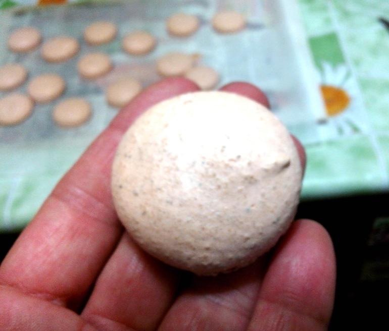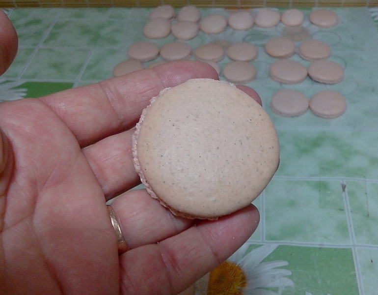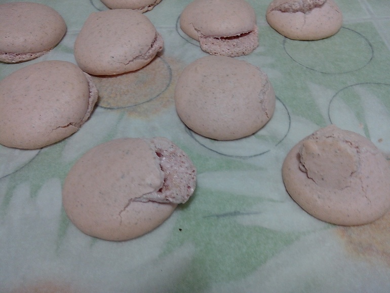 ВОПРОСЫ кондитеровДевочки, первый раз решила сделать макарон(макарун). Ну и это, конечно, блин... С огромным количеством комочков. Делала по рецепту Энди. Вроде бы всё выдержала, взбила, померила и взвесила. Первую партию отправила в духовку. Через пару минут появилась юбочка. В общем, вроде как всё пошло так, как надо. Правда, юбочка вроде должна быть такой же высоты, как и верх, у меня она поменьше. Ну да ладно, я и этому рада. А вот вторая партия ввела меня в ступор и в последствии в глубокое размышление - что не так???