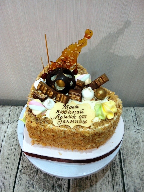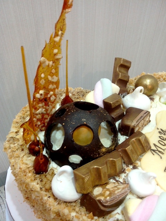 Честно говоря, даже писать тут не о чем. При изготовлении этого торта никто не пострадал, ничто не уничтожилось, и даже мои нервы были как под новопасситом. Так что просто покажу то, что вышло. Клиентка осталась довольна. Особенно та, которой и предназначался торт, так как курьер её разбудил в 7 часов утра
