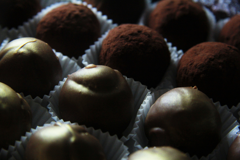 Трюфели с корицей и имбирем в бельгийском какао и с маракуйей в молочном шоколаде. На заднем плане в коробочке мармелад в подарок)