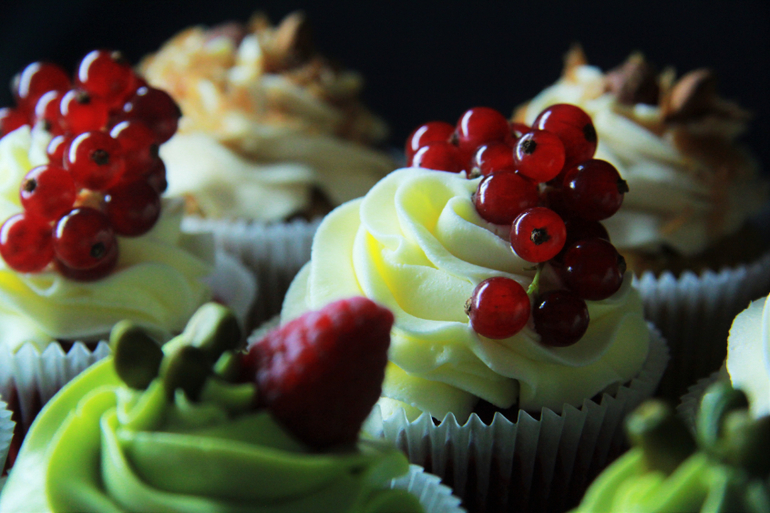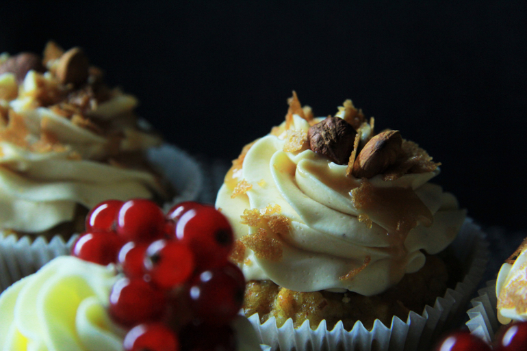 Итак, в наборе шоколадные капкейки с клубничным конфи и фисташковым кремом, красный бархат с малиновым конфи и кремчизом, морковные с ананасовой карамелью и фундучным сливочным кремом.