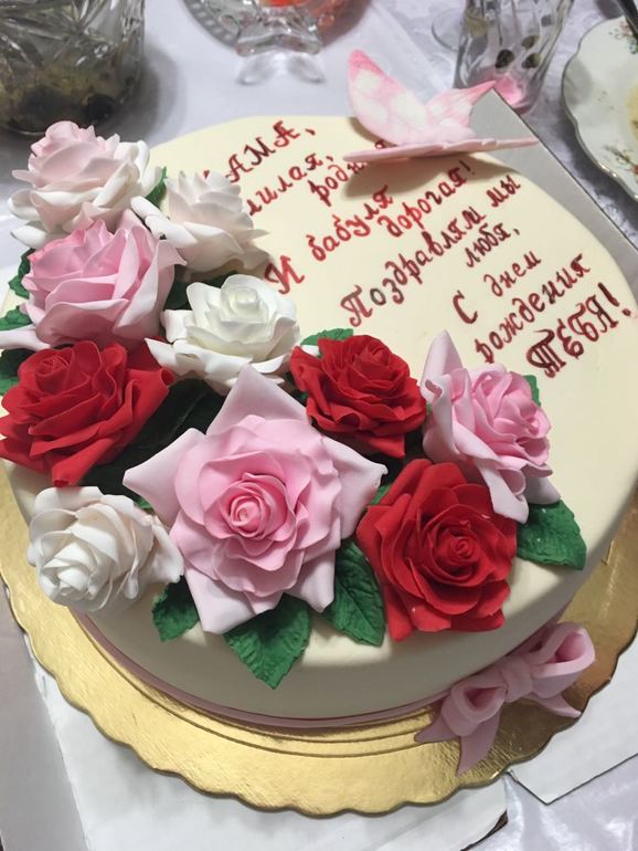 Мне кажется, когда такая большая надпись, надо ее как-то ровными строчками делать, друг под другом, а уж где осталось место-розы сажать. Сама с ужасом делаю надписи, и всегда рассказываю, что такую большую я не умещу, ведь торт не большой, плюс надо место для декора, плюс что-то еще выдумаю, в общем я настаиваю на лаконичности)