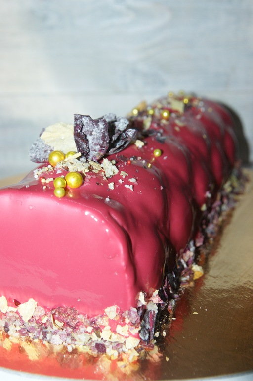 Внутри медовый бисквит, пропитанный сахарным сиропом, брусничное конфи, ванильное кремю на белом шоколаде