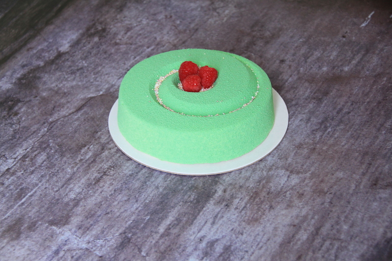 Фисташковый бисквит, хрустящий слой, малиновое кули, малиновое кремю, фисташково-сырный мусс.