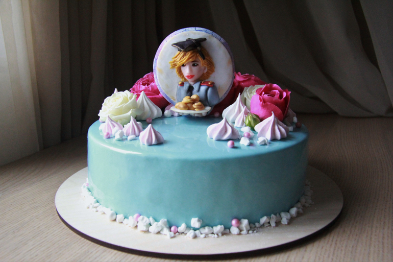 Ну и мой кошмар))) Заказчица моя знакомая, учились с ней параллельных классах, но не общались, в принципе. Ну и звонит она с просьбой сделать тортик для ее мамы. Не проблема. С составом быстро определились, а вот дальше..... Сначала был торт "Мама, ты помнишь?", где должны были быть 5!!!! младенцев,это при том, что у нее только 2 детей! На скромный вопрос: "А кто еще 3?" был ответ: "Внуки и МУЖ!!!!" Мля.... Моя логика билась в конвульсиях))) Я этот дизайн не выношу, стала отговаривать. Тут у нее возникла идея: мама подполковник милиции на пенсии, преподает в ВУЗе и печет пироги и плюшки. А можно на торт погоны, шапочку с кисточкой и плюшки? На муссовый!!!!!! Я сказала, что это будет (тут мат). Тогда появился вариант с мамонтенком. Ну это хоть и банально, но мило) Думаю, ну ладно, голубая глазурь, шоколадные льдинки и мамонтенок. И тут я читаю: "А можно сделать нас пятерых мамонтятами?" Я выпала в осадок.... Ну конечно!!!! А что? Один седой, другой рябой, третий с соской.... Атас! Не выдержав всего этого, я сказала, что не буду делать ей торт!!! И тут она говорит: "Ну ладно, делай как считаешь нужным, это я помечтала" Не дай Бог дожить до таких мечт..... Я согласилась, но в душе я уже очень не хотела его делать, понимая, что у нас ну вообще разные представления о том, как должен выглядеть красивый торт)))) Ну и в итоге появилось вот это "чудо" на прянике))))) В соц.сети выкладывала без него, но вам покажу))))