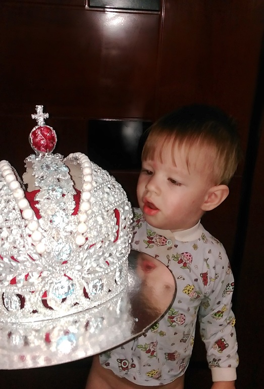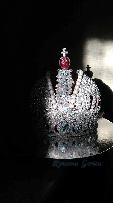 Проба перану никак не могу мимо красивых тортов пройти,тоже хочу научиться ... сделала корону,немного ободок шире сделала,чтоб на торт одевать и снимать спокойно. поэтому форма чуть отличается от оригинала,ну вот так у меня получилось.(( изомальт не умею топить,решила не тратить зазря и "бриллианты" рисовала. все камешки да и вообще весь верх- мастика,немного сахара,все окрашено серебром и разным цветом. внутри торт Красный бархат на 1,1кг)