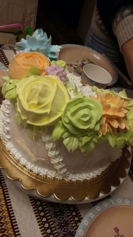 Пыталась его выровнять белковым кремом и что то у меня не очень это получилось(((