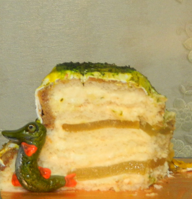 Пока я кормила ребенка, родня смела торт, и для фото разреза остался этот скромный кусочек, чудом уцелевший(видимо, про меня все-таки кто-то вспомнил)). Даже рыб всех слопали, кроме одной, и озеро.. Мужа есть я изначально не разрешила, а то бы и его без головы как минимум застала)) Оставили на память.