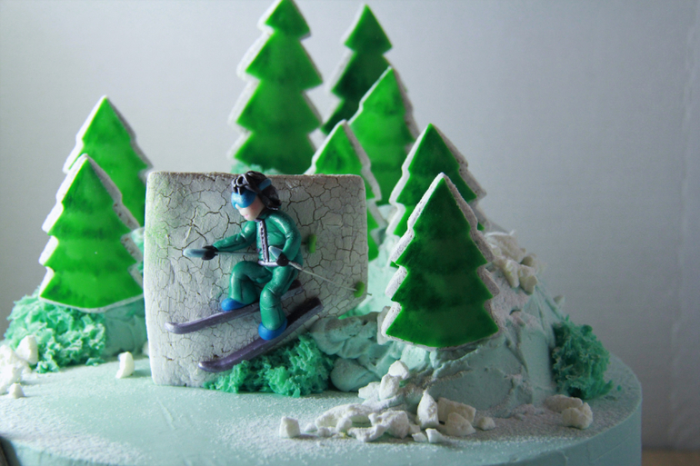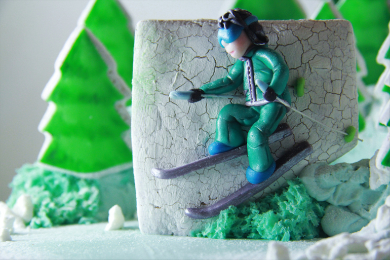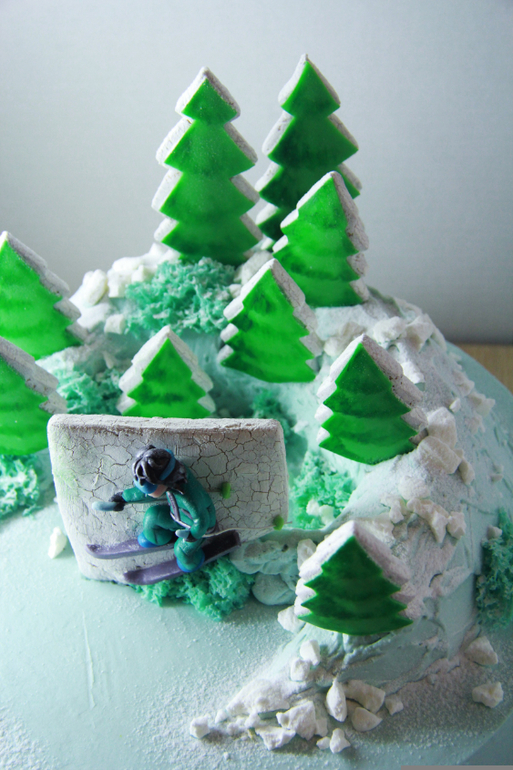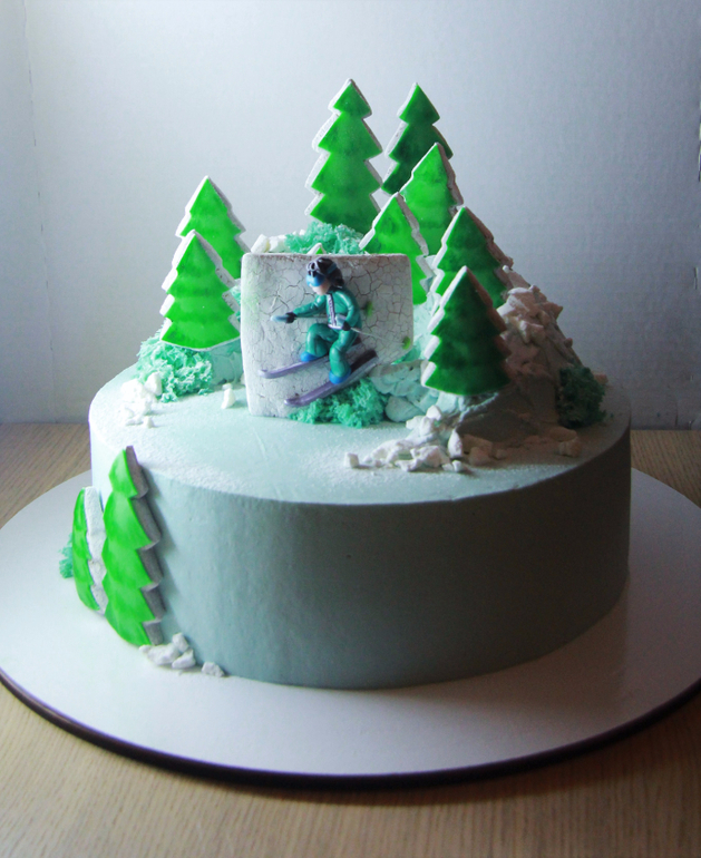 Потом был вот этот на 5 кг. Я влюбилась в этот торт, хотя в голове он был обычным) Просто елочки и пряник с лыжницей. Но он получился такой классный! На фото вообще не видно(((( Елки не такого зверски зеленого цвета, да и вообще он гораздо нежнее.