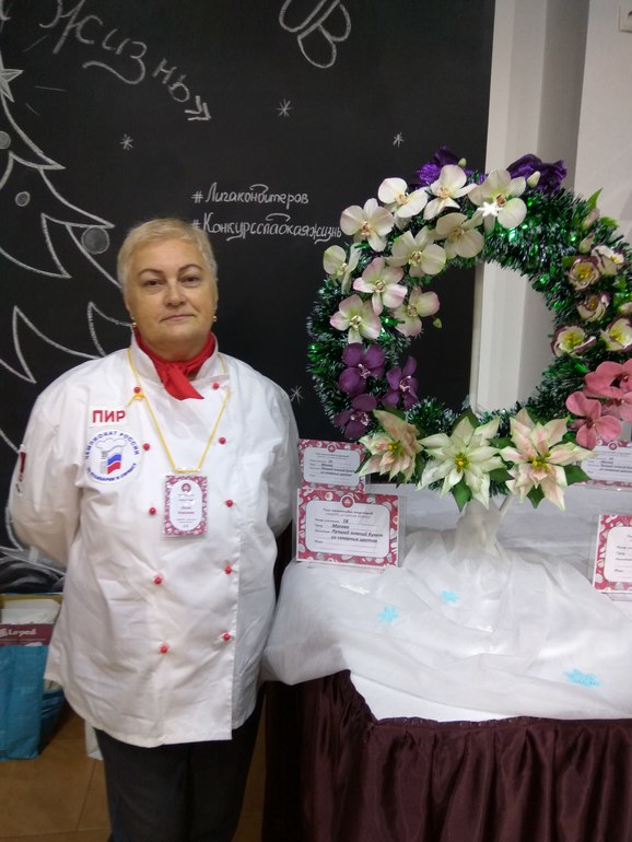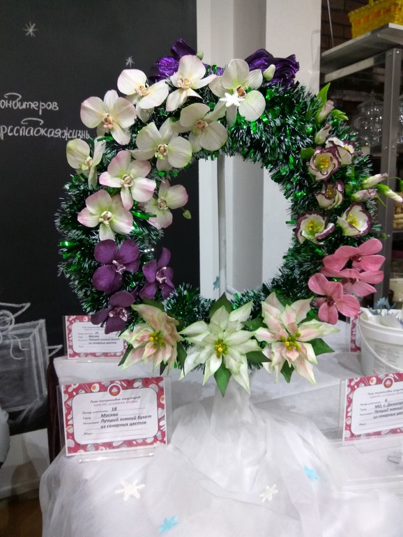 Фигурки и цветы из мастикиРождественский венок. 10 фаленопсисов с бутончиками,6 ванд, 5 лизантусов с 6 бутонами, 3 пуансетии. Серебряная медаль.
