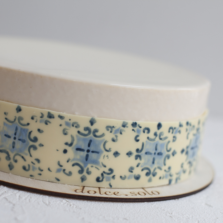 Евродесерты (муссовые торты и пирожные)Орнамент взяла с реальной плитки, нарисован какао маслом на белом шоколаде.