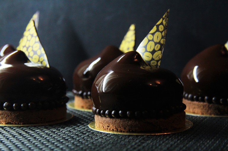 Пирожные. Шоколадное сабле, клубничное конфи, мусс из молочного шоколада, зеркальная глазурь на какао. Декор - шоколад.