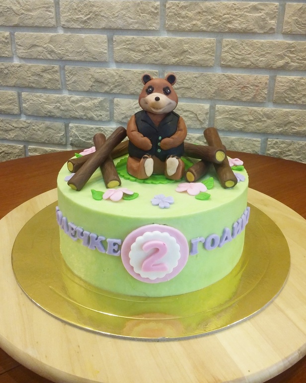 Из того самого, советского мультика. Этот Мишка - любимый персонаж маленькой Юленьки) Идею с бревнами предложила мама Юли. В то же время, ей хотелось, чтобы тортик был нежным. В общем, я попыталась совместить все это, получилось вот так. Заказчики остались довольны, Юленька узнала мишку и откусила ему нос))).
