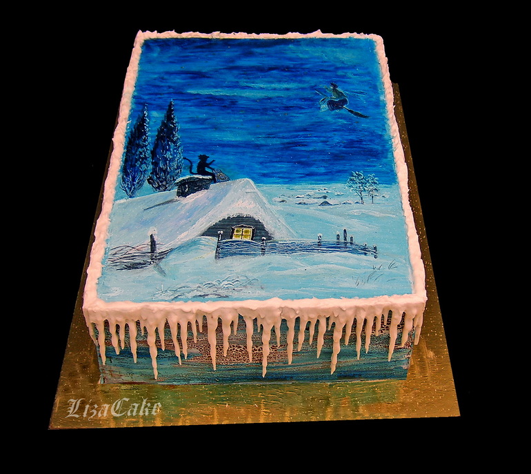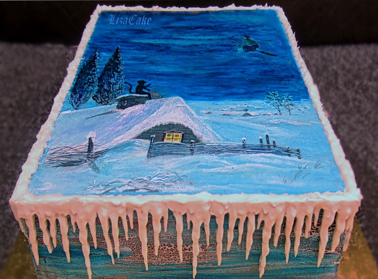 Лиза, умничка! Очень красиво! Я обожаю эти зимние пейзажи нарисованные, но вот все не случилось повода нарисовать, может, в следующем году)) Потрясающий тортик! Я думаю, никто не обиделся на тему, я так вообще эту сказку и сейчас воспринимаю, как волшебство и чудеса, ну знаешь, как в детстве, веришь в деда мороза, внутри ощущение чего-то удивительного, недосягаемого, грандиозного... И "вечера на хуторе.." именно такие ощущения вызывают...Может, потому что читала именно в детстве...)) Внутрь что положила?