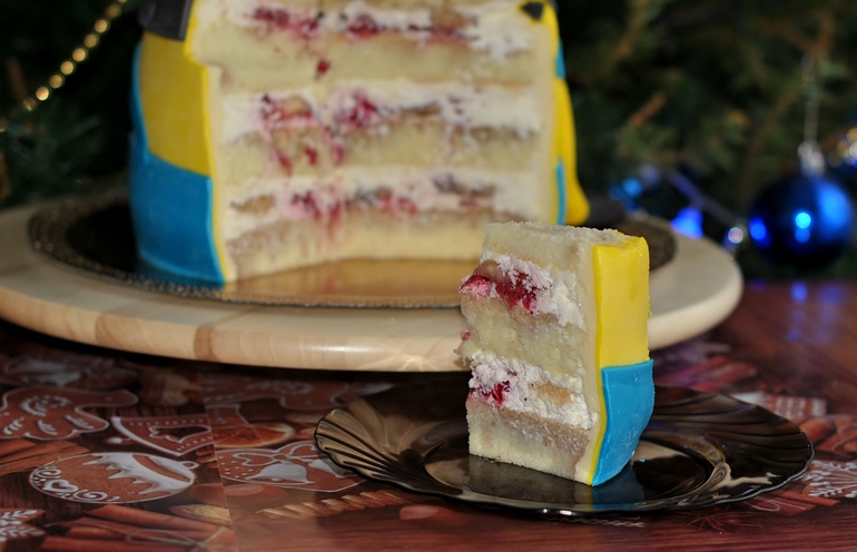 Под катом фото разреза. Ванильный бисквит с сливочно-маскарпоновым кремом, земляникой, смородинкой и бананами.