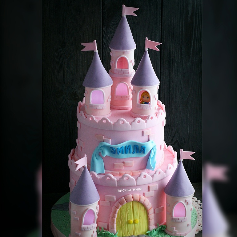 Торты детскиеЗамок вышел в 6 кг. Высота 45 см. Внутри: клубнично-бананов суфле и черничный творожок.
