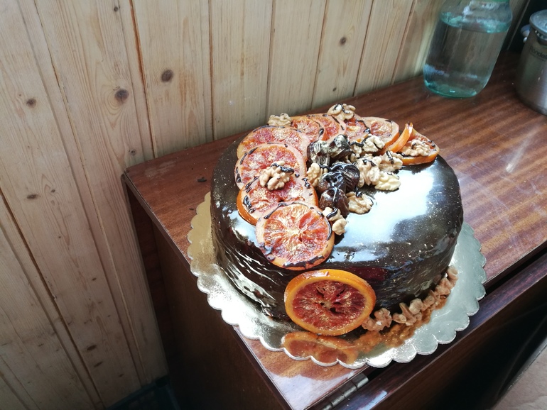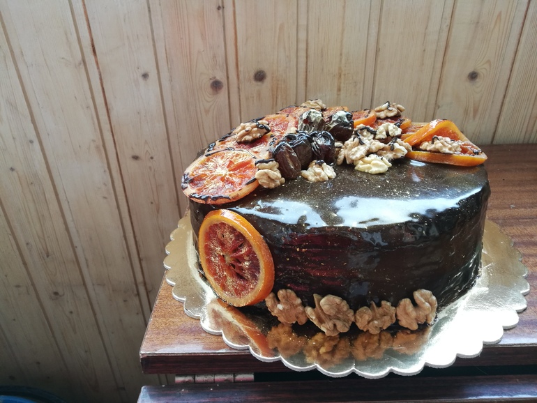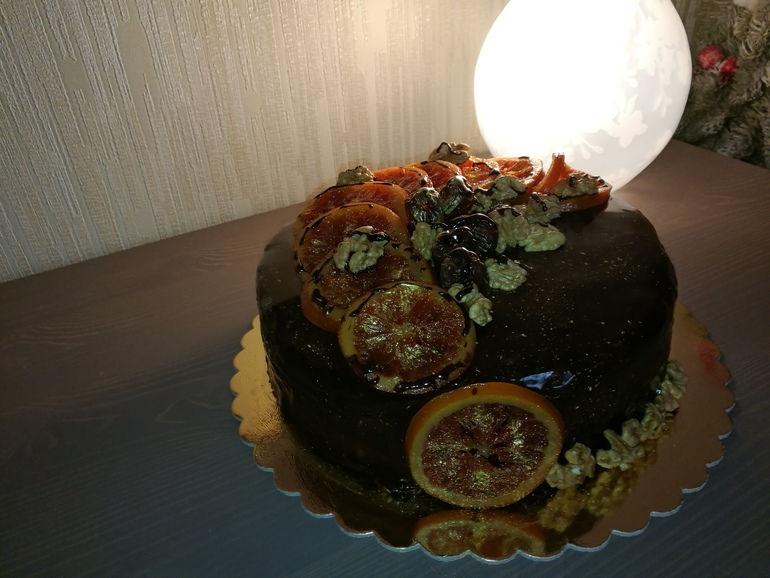 Вчера карамелизировала апельсины первый раз)), вот ими и решила сверху украсить, орехи есть в коржах, ну и пару фиников до кучи)))