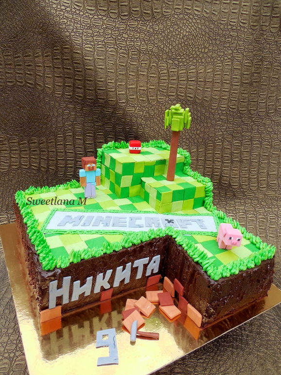 Украшение тортов кремом,шоколадом, фруктамиВот такой вариант торта в стиле майнкрафт,шоколадно-мастичный.Внутри шоколадный бисквит,сливочно-карамельный крем,бананы.