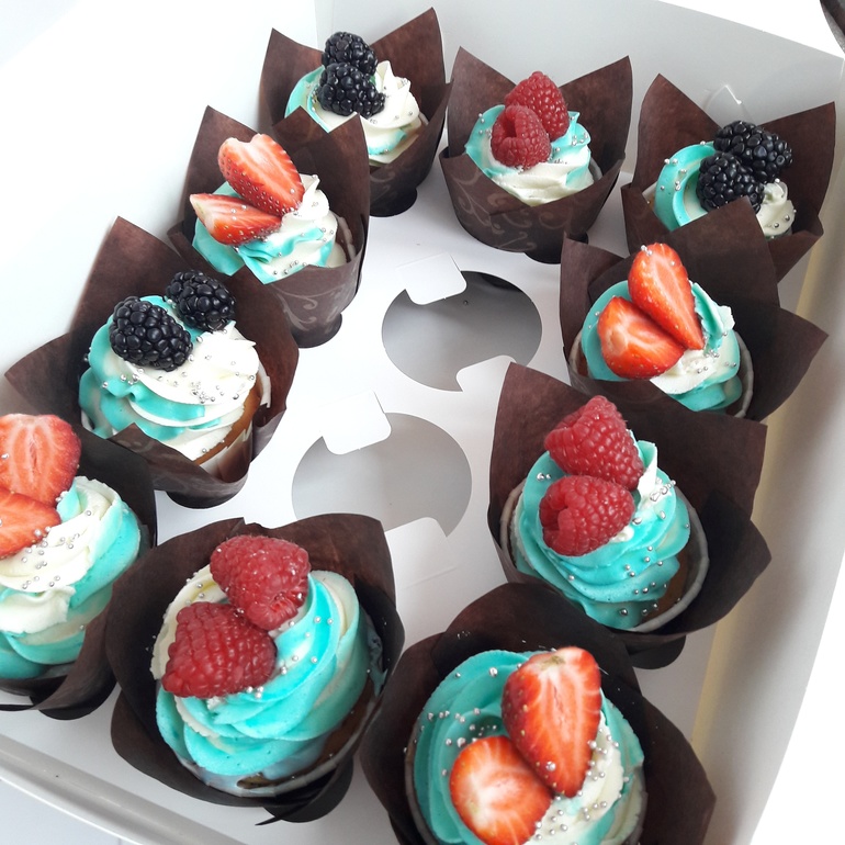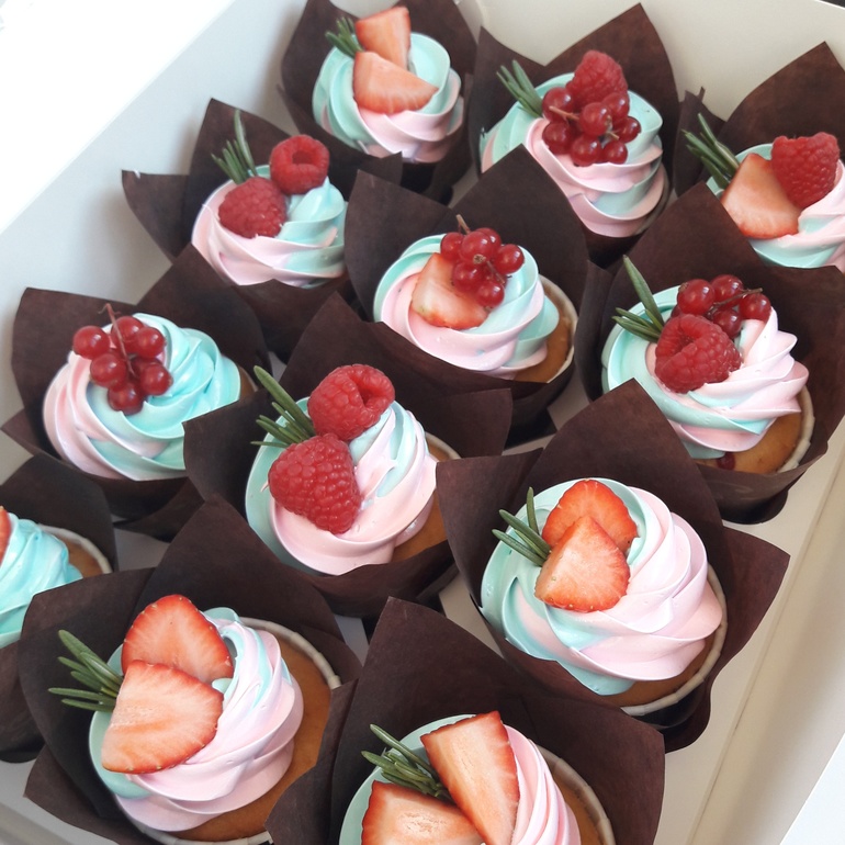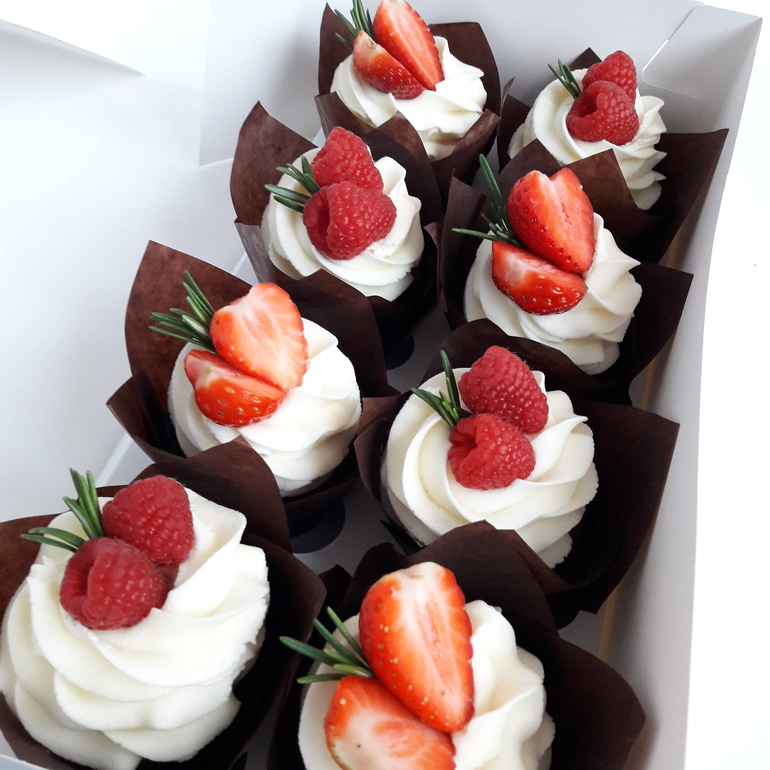 Капкейки ванильные и шоколадные , с шапочкой из кремчиза и швейцарской меренги , внутри ганаш на молочном шоколаде и малиновый курд . Под катом еще фото