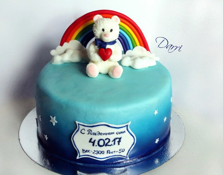 Яркий, радужный тортик сделали с дочкой на рождение сына замечательному доктору стоматологу. Внутри молочные коржи, взбитые сливки, пропитка тоже молочная. Весит такой тортик 2,5 кг.