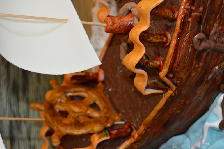 По краям, детали - мастика, верх - шоколадный ганаш с рисунком под деревянную палубу.