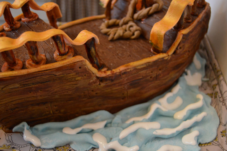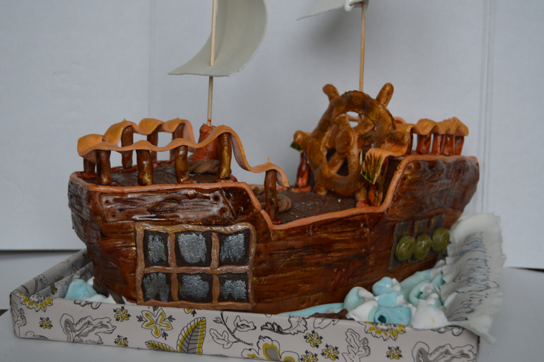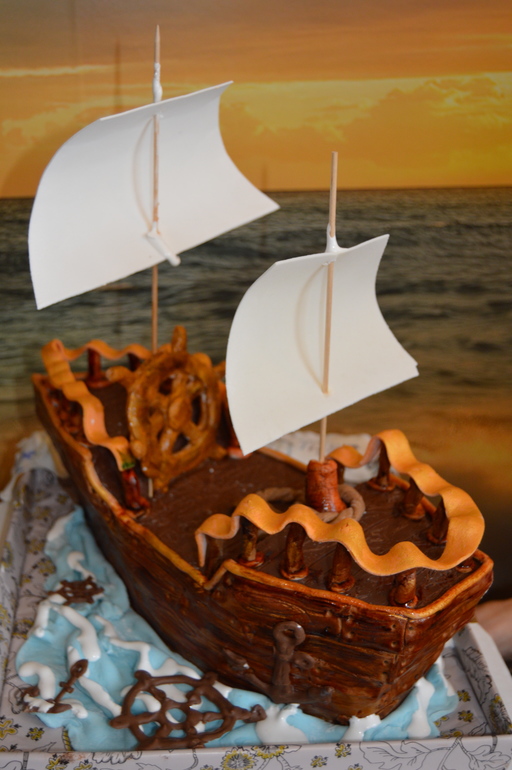 Маловато было времени на детали (и даже парусов было бы больше и качественнее). Но корабль для столь короткого срока изготовления, кажется, удался. Надеюсь, вам тоже понравится. Внутри просили сделать Прагу (по ГОСТу). Я слегка отступила с разрешения мамы именинника и пропитала абрикосовым сиропом.