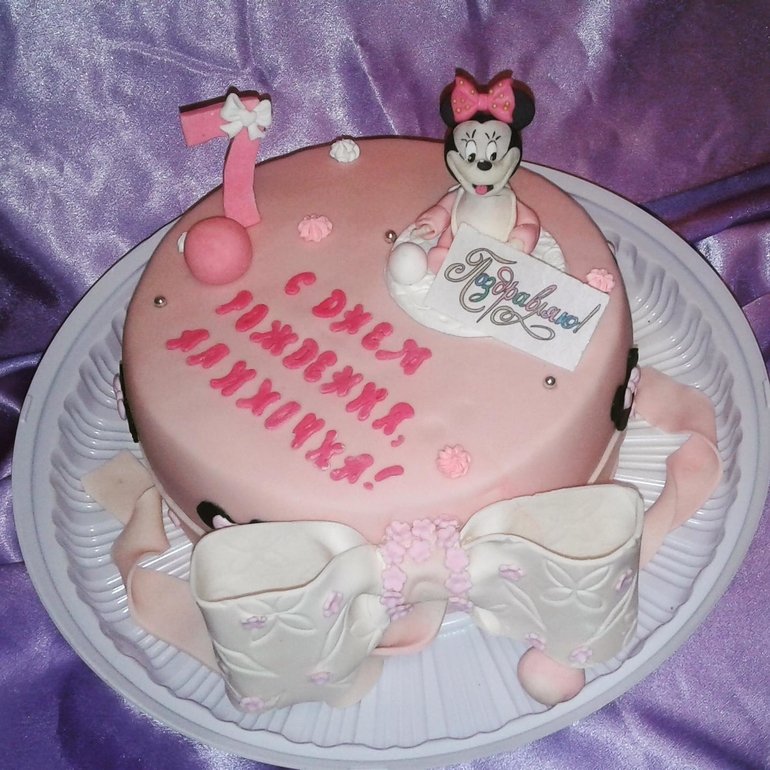 Покритикую, если позволите. 1. Дешевое дно от коробки, отсутствие подложки портят впечатление от торта сильнее, чем неудавшийся бант; 2. Слабое выравнивание, а толстая мастика еще больше скругляет бока и край, отчего торт смотрится еще ниже; 3. С похожестью фигурки и так все понятно (разве у Минни рот до ушей?)- мне кажется, дело в мастике