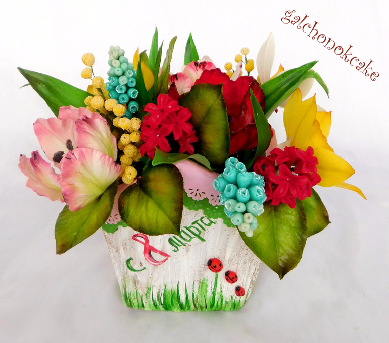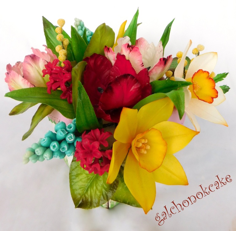 Фигурки и цветы из мастикитак надоела зима, что сов нет, захотелось чего-то яркого, солнечного) так и родилась композиция из тюльпанов, нарциссов, мускари и мимозы)