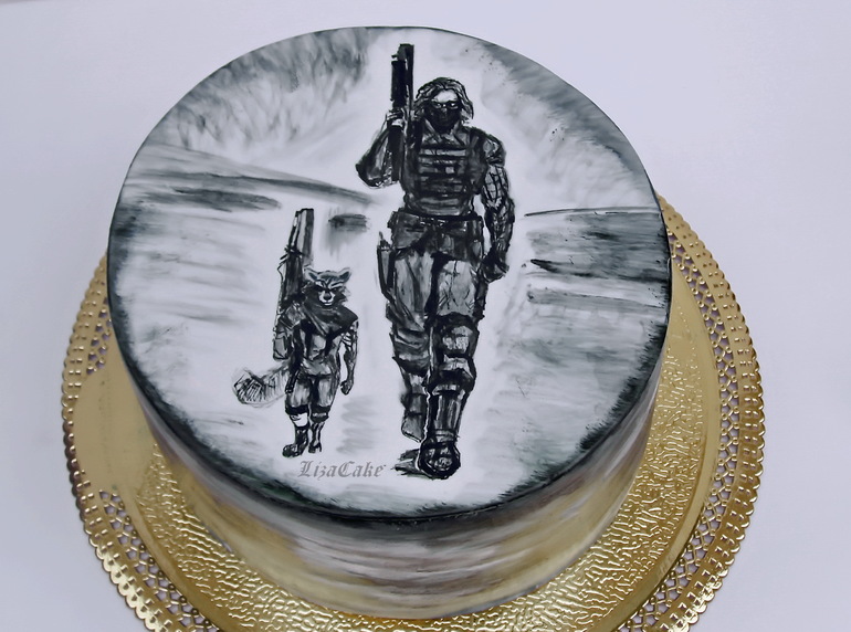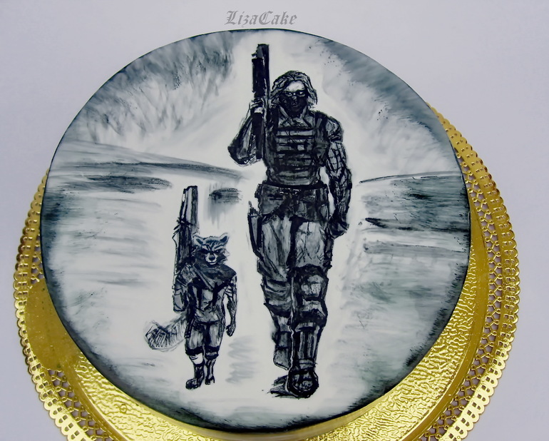 Торт (как я и люблю), опять же, скорее гиковский, чем среднестатистический и имеет прямой отсыл к кинематографической вселенной Marvel - Зимний солдат (Джеймс /Баки/ Барнс) персонаж всех фильмов с Капитаном Америка, а енот Ракета - Стражи галактики)