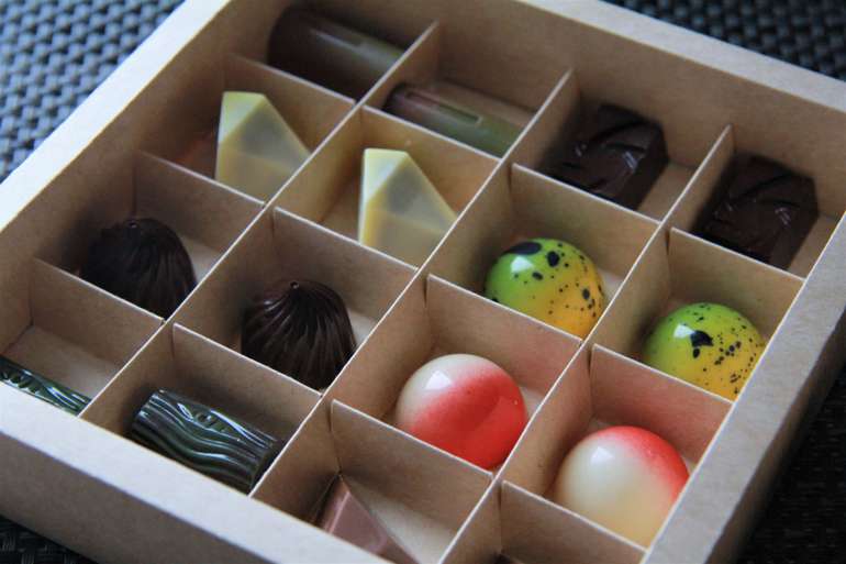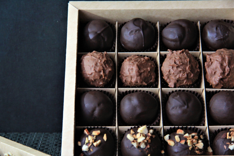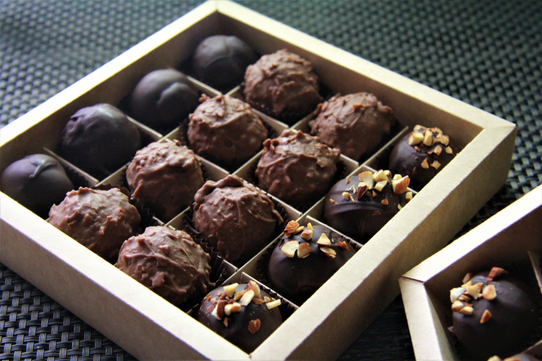 Трюфели: бейлиз в молочном шоколаде с вафельной крошкой, маракуйя в темном шоколаде, каштан-пралине в темном шоколаде с орешками.