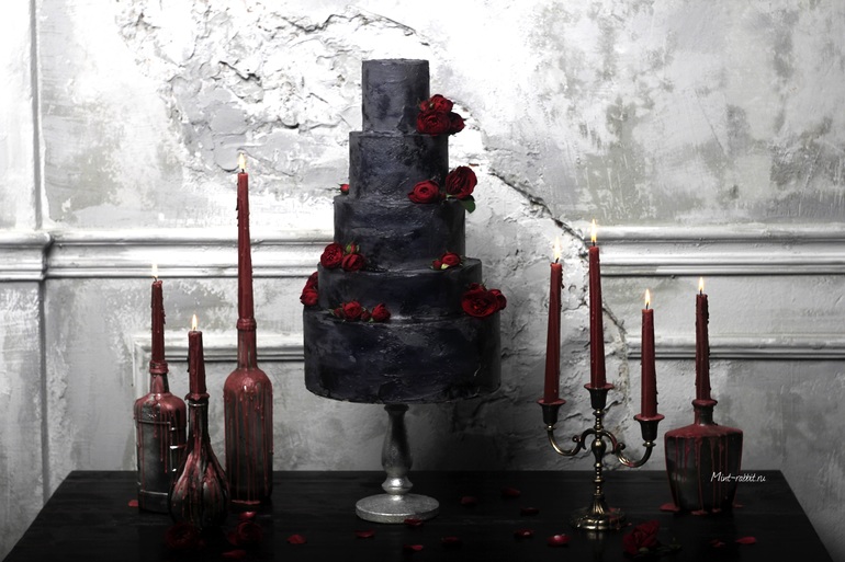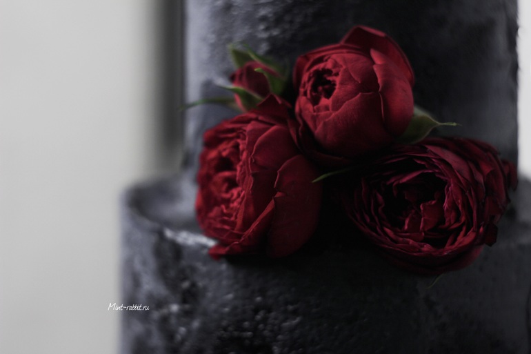 Ого! Необычный цвет для свадебного торта. А пионы живые или сахарные?