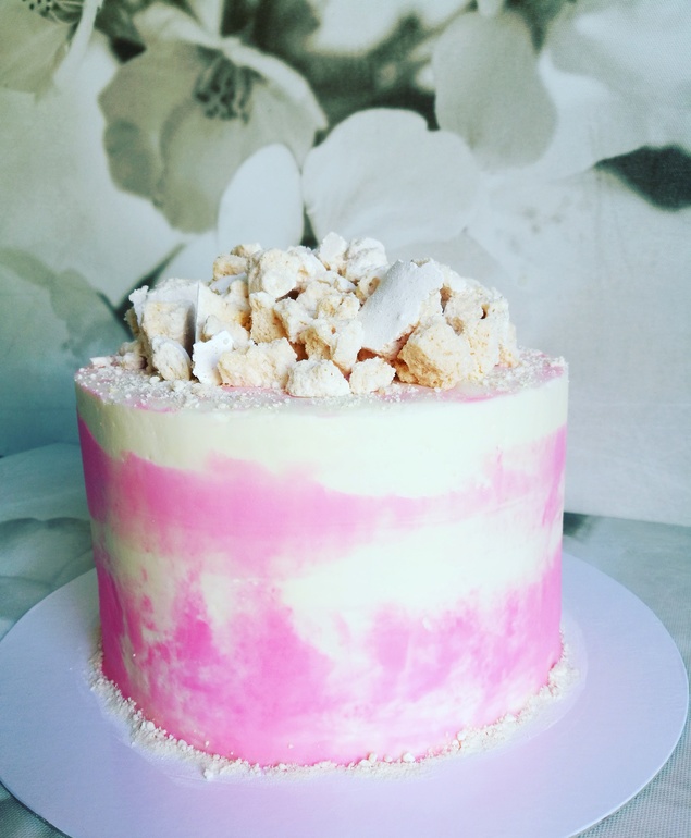 Маковый бисквит, черносмородиновое желе, ягоды смородины, безе и ванильный сырно-сливочный крем.