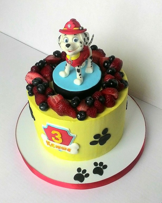Украшение тортов кремом,шоколадом, фруктамиМаршал стал главным героем на тортах. По мнению детей - он самый веселый и жизнерадостный далматинец. У него дурашливое поведение и он постоянно попадает в комичные и смешные ситуации. В чем-то он неуклюжий, может при ходьбе запутаться в своих лапах и упасть, но всегда поднимается с гордо поднятой головой)))
